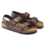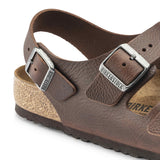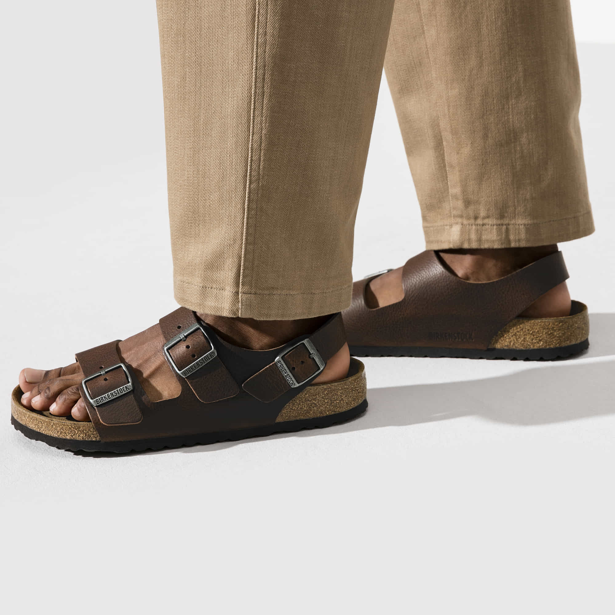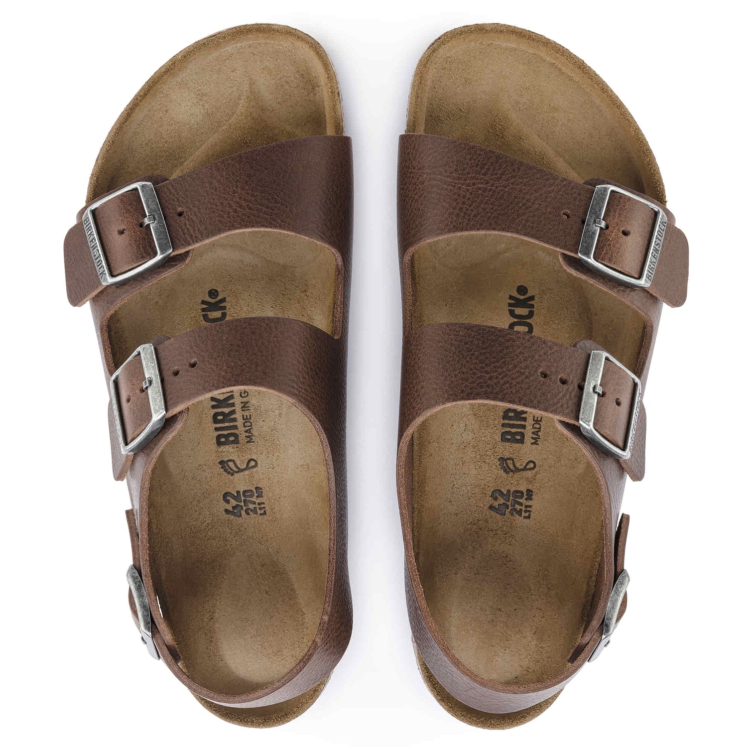 The BIRKENSTOCK Milano guarantees maximum grip and gives the feet stability during all activities. This is thanks to the slightly more compact upper with two straps and the wide ankle strap. This version in a vintage look is for anyone who wants their shoe to have a subtle patina from the outset. This is possible with the surface texture of the high-quality, soft natural leather.