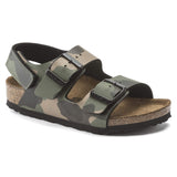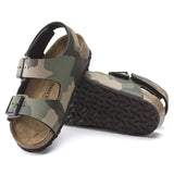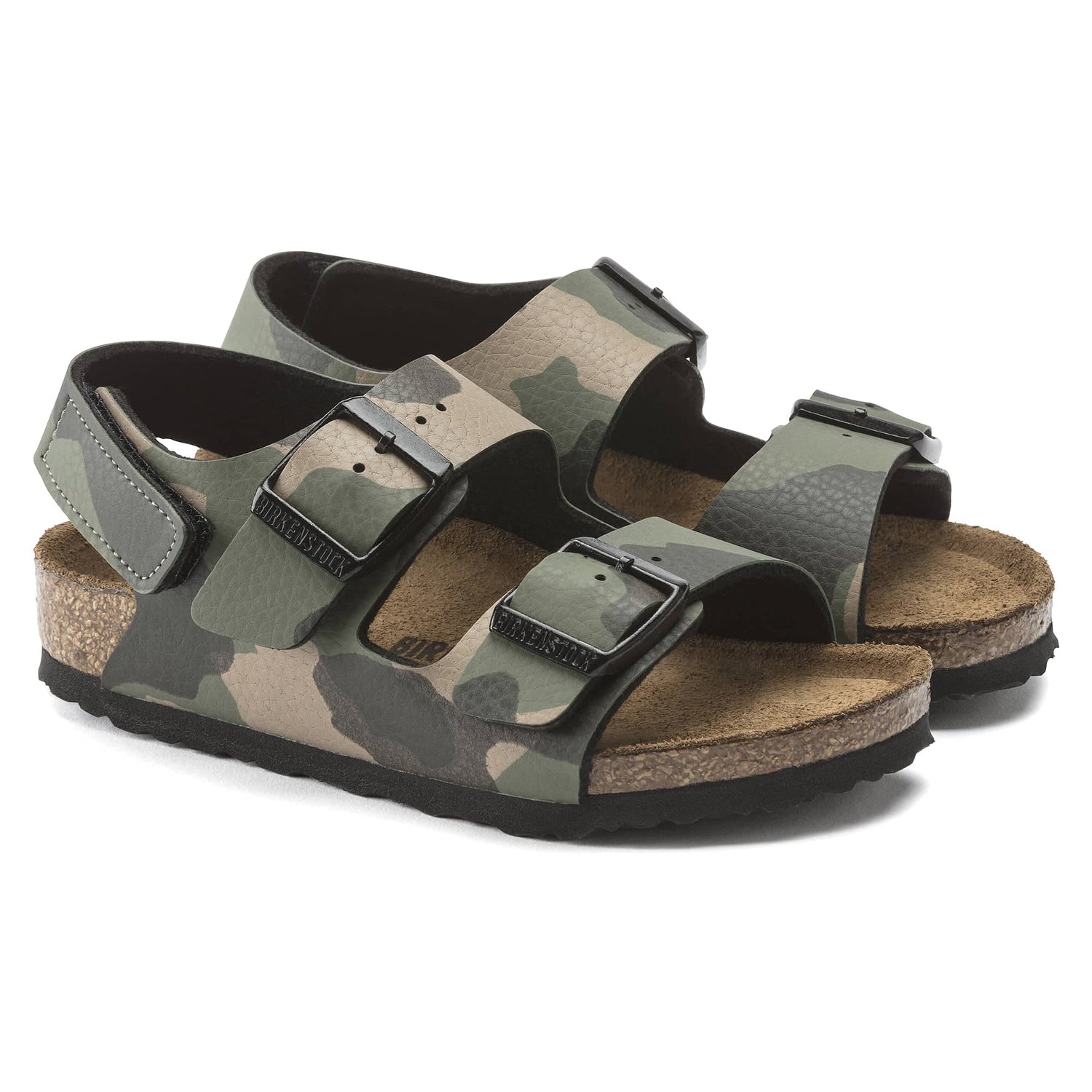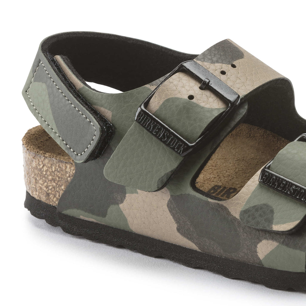 Maximum grip, stability, and a perfect fit! The BIRKENSTOCK Milano HL boasts perfect functionality. The hook-and-loop fasteners also make those early mornings less stressful with their easy handling. They also ensure that the sandals remain on the feet also during boisterous play! This version of the sandal is tone-on-tone, giving it a trendy camouflage look. It could almost be mistaken for real leather. The upper is made from the skin-friendly, hard-wearing synthetic material Birko-Flor®.