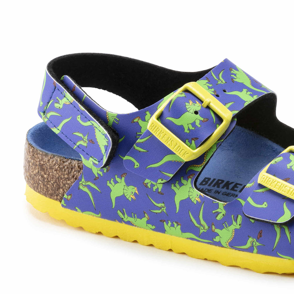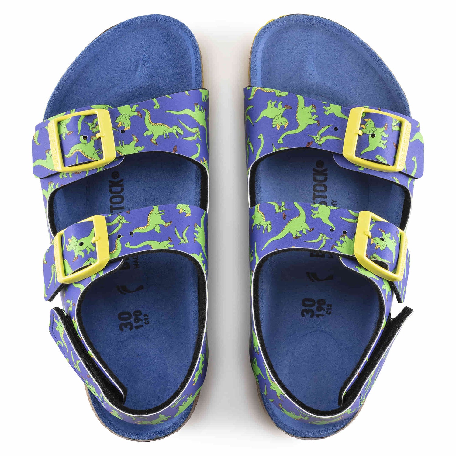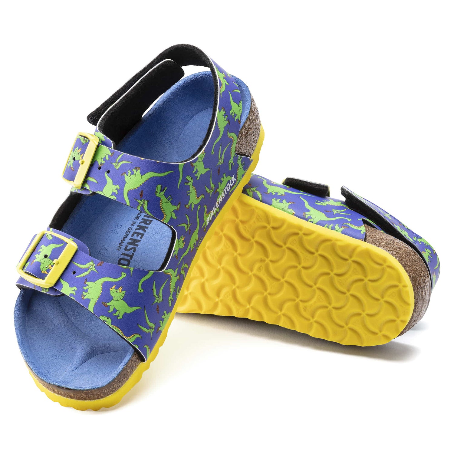 Maximum grip, stability, and a perfect fit! The BIRKENSTOCK Milano HL boasts perfect functionality. The hook-and-loop fasteners also make those early mornings less stressful with their easy handling. They also ensure that the sandals remain on the feet also during boisterous play! This version of the sandal will set kids hearts racing. The colorful dinosaur print will put a smile on kids faces all day long. The color-coordinated details round off the shoes look of sophistication. The upper is made from the skin-friendly, hard-wearing synthetic material Birko-Flor®.