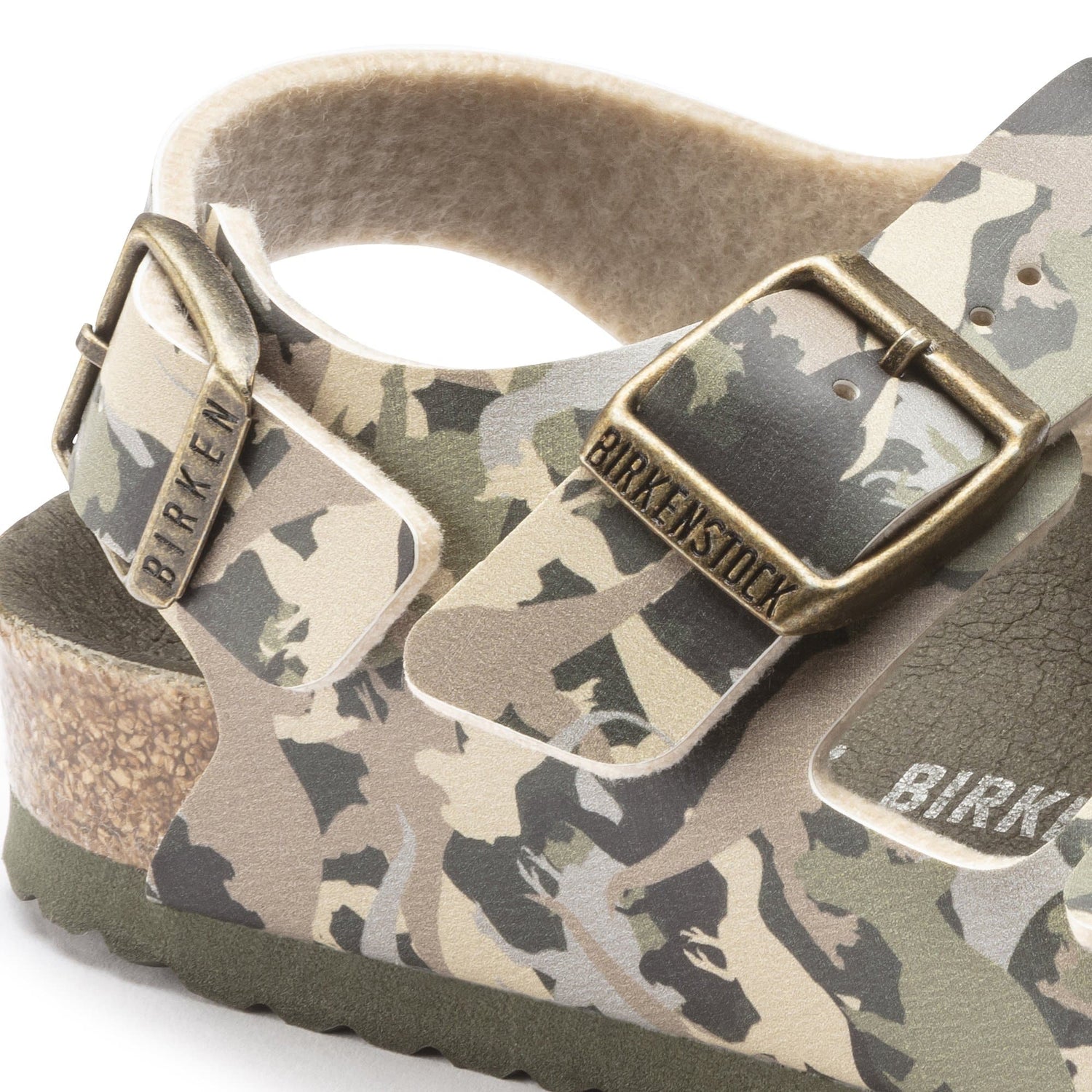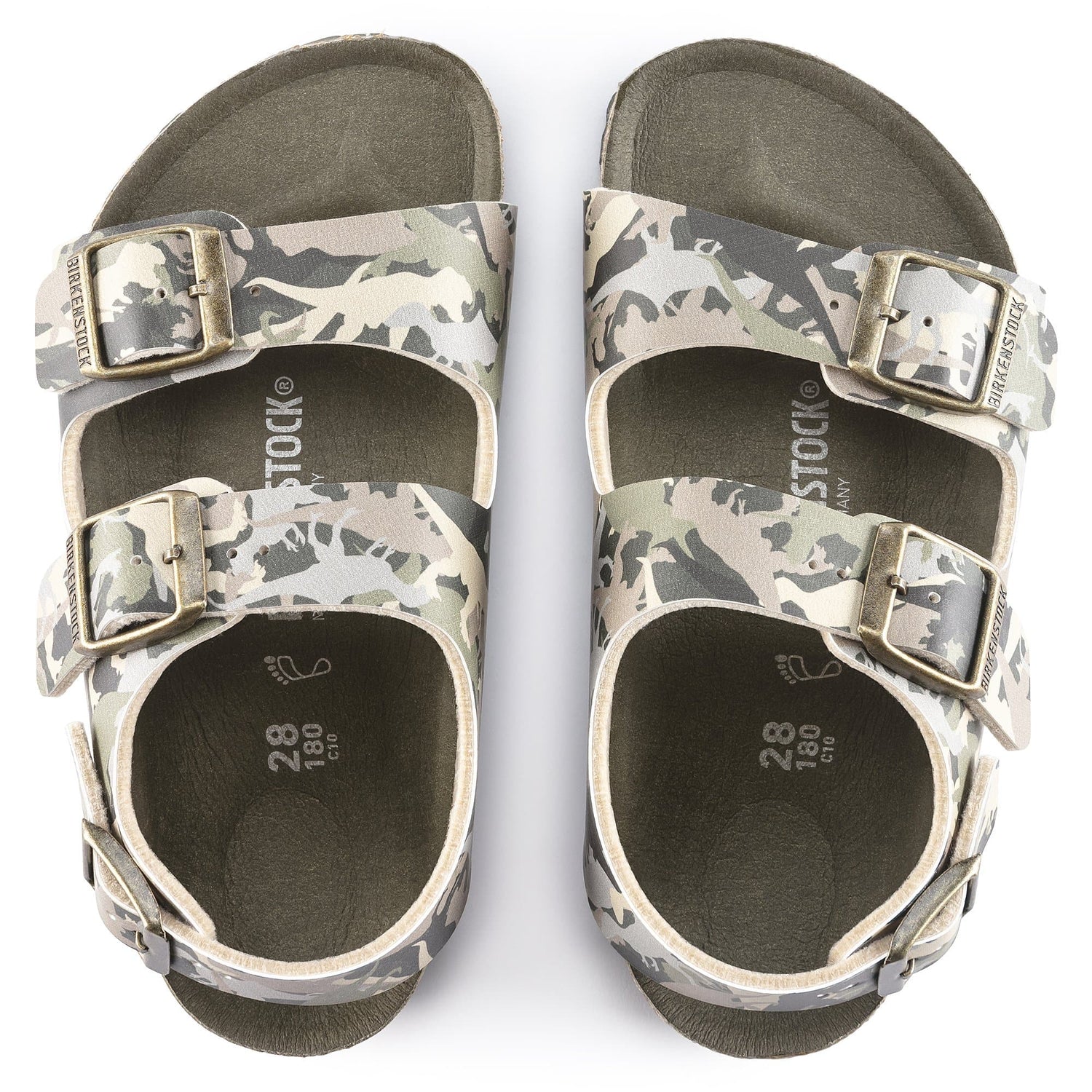 Maximum grip, stability, and a perfect fit! The BIRKENSTOCK Milano offers all of this thanks to its compact design with a heel strap also during boisterous play. This version of the sandal will set boys hearts racing. The colorful dinosaur print will put a smile on kids faces all day long. The color-coordinated footbed rounds off the shoe look of sophistication. The upper is made from the skin-friendly, hard-wearing synthetic material Birko-Flor®.