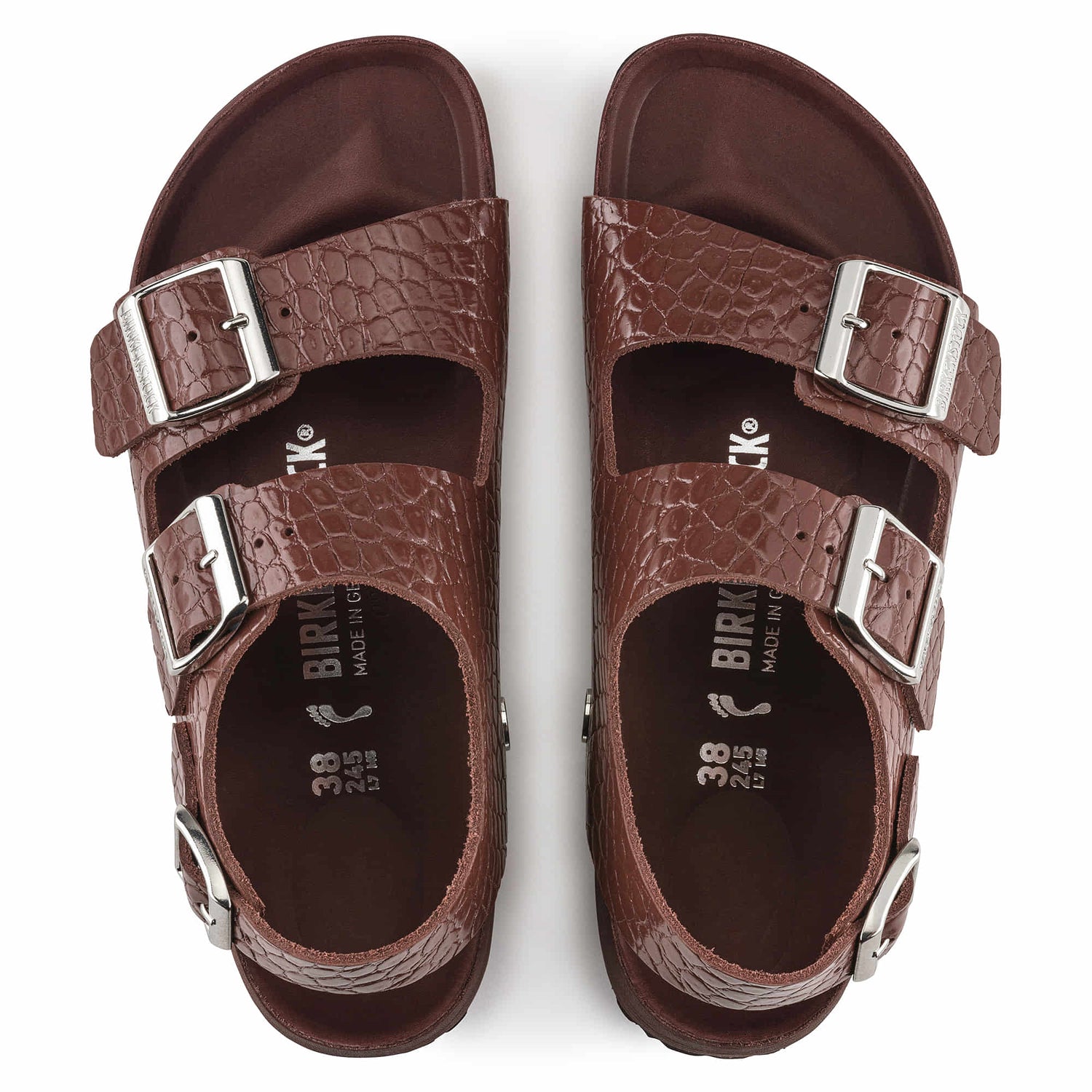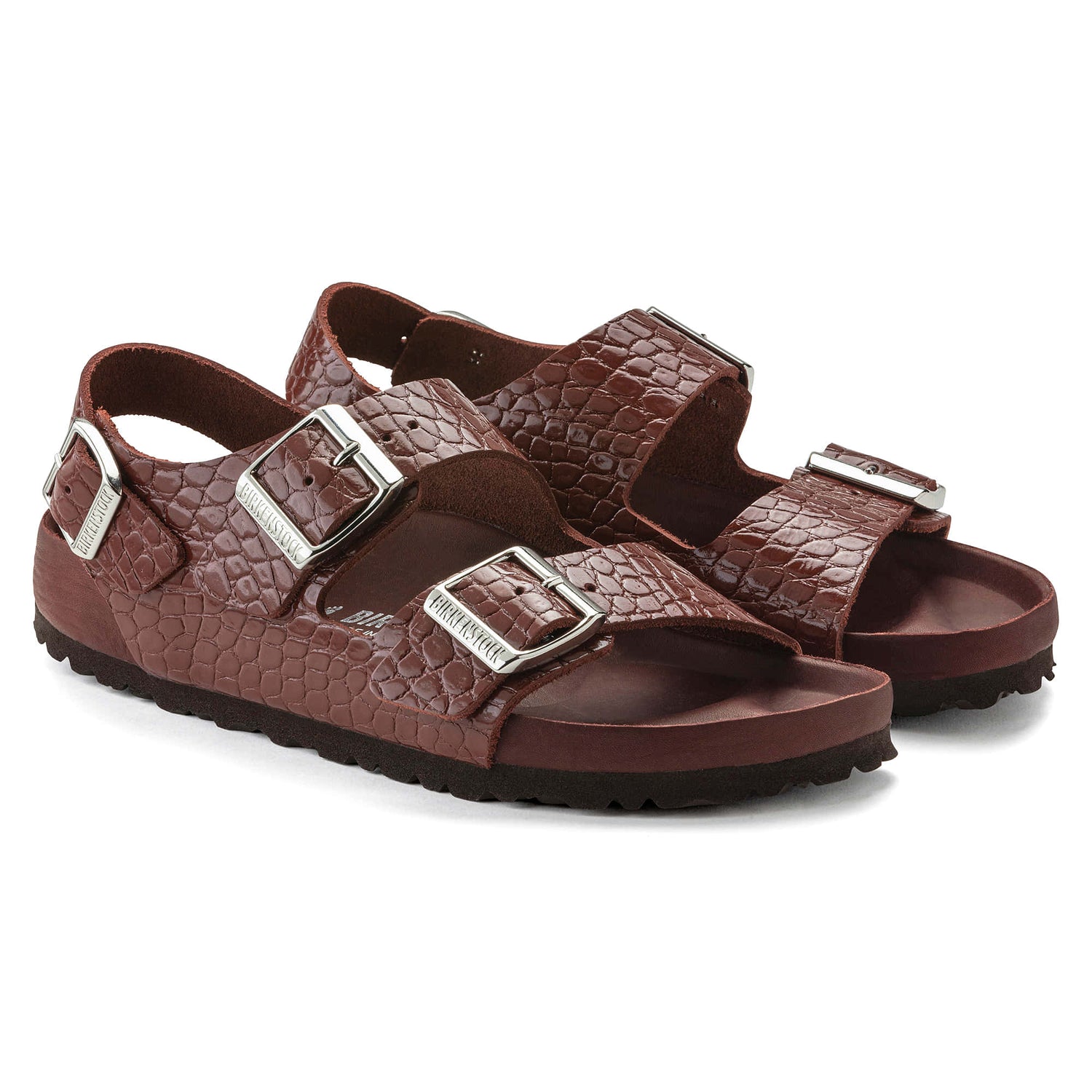 Maximum grip, stability, and a perfect fit! The BIRKENSTOCK Milano offers all of this thanks to its compact design with an ankle strap. This version boasts a reptile leather look and feel. Inspired by nature, no two shoes have the same look and feel. The color-coordinated outsole rounds off the shoes look of sophistication. The exquisite footbed is fully lined with soft piumato leather, making it exceptionally comfortable. The upper is made from embossed natural leather.