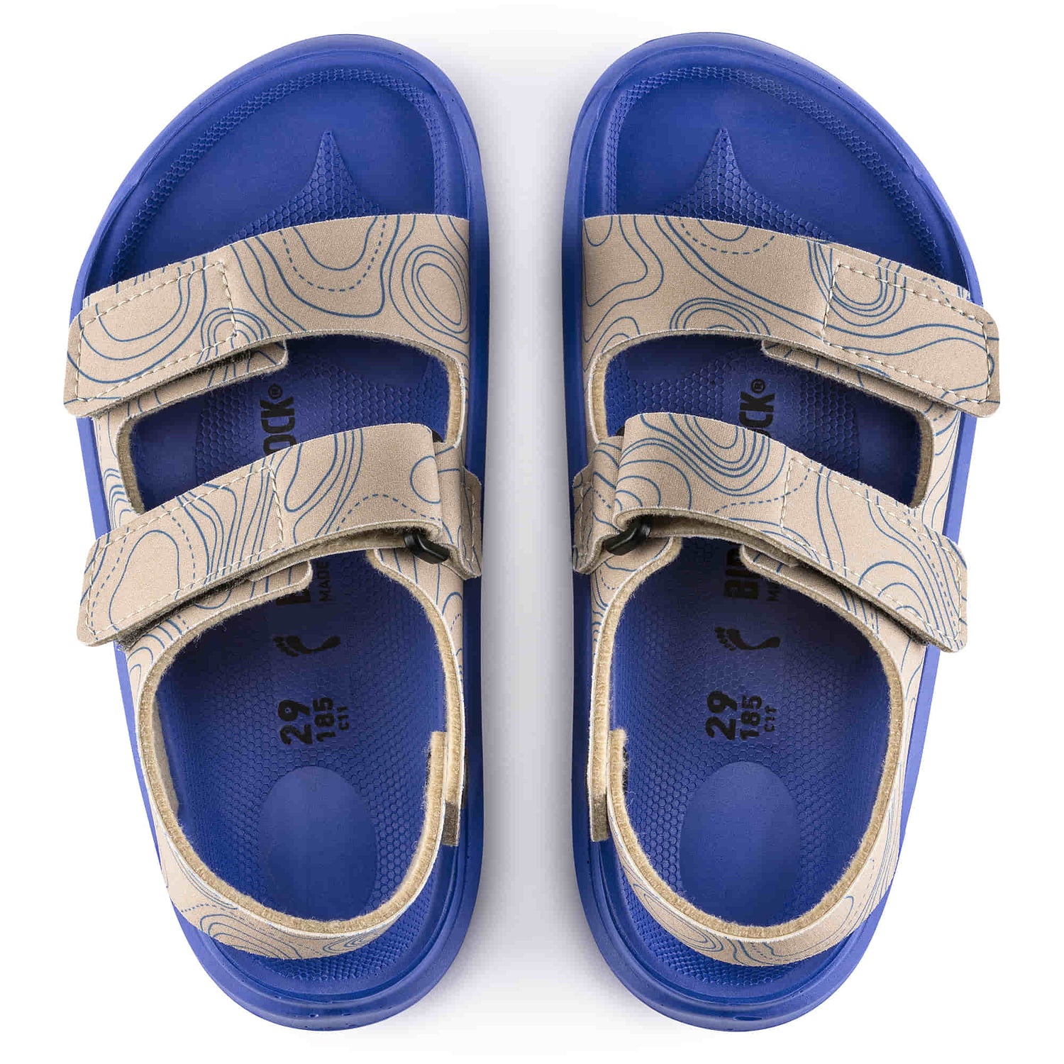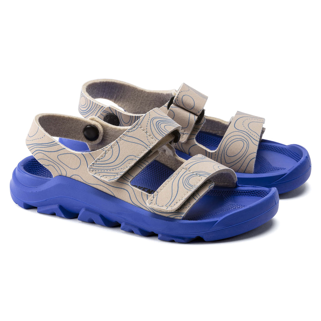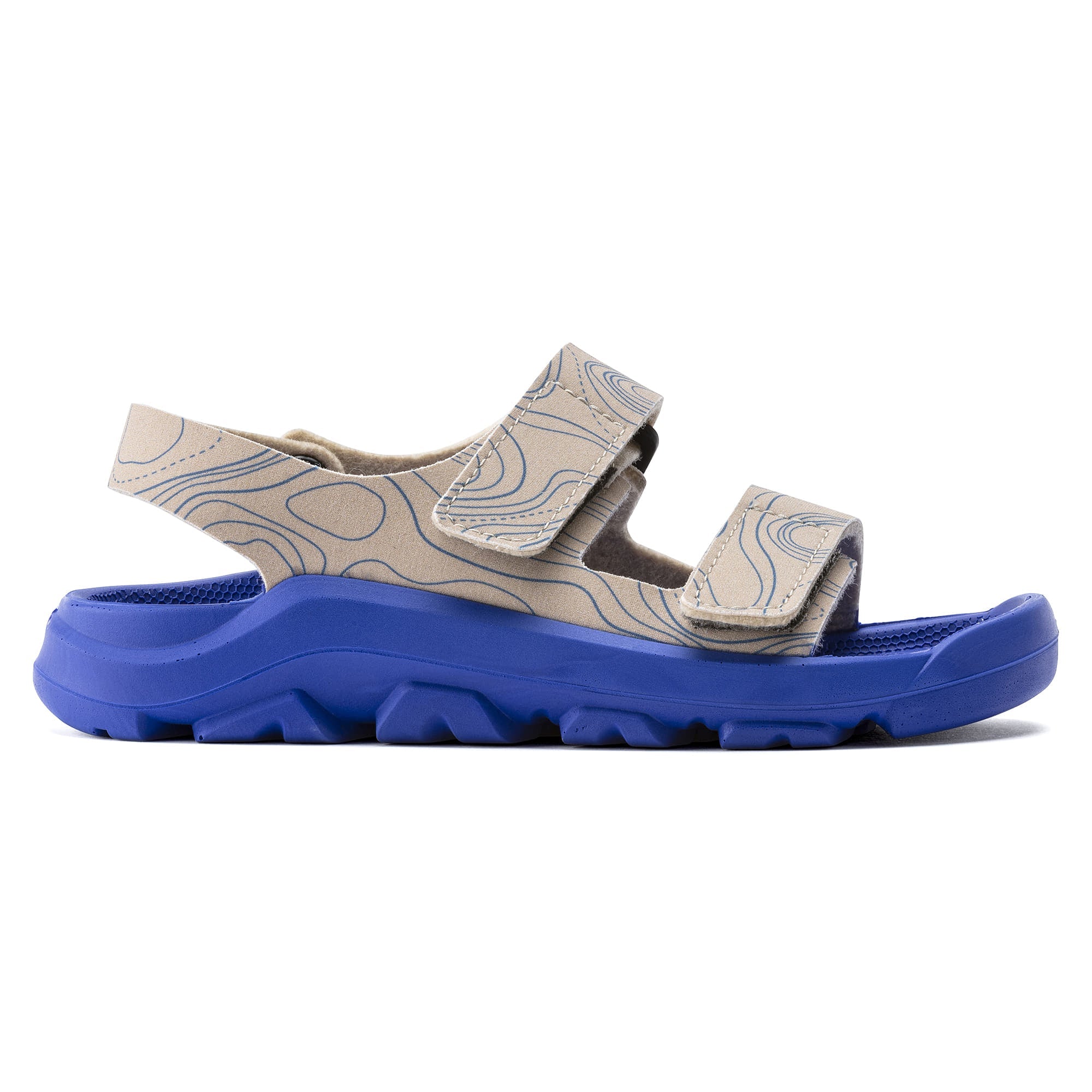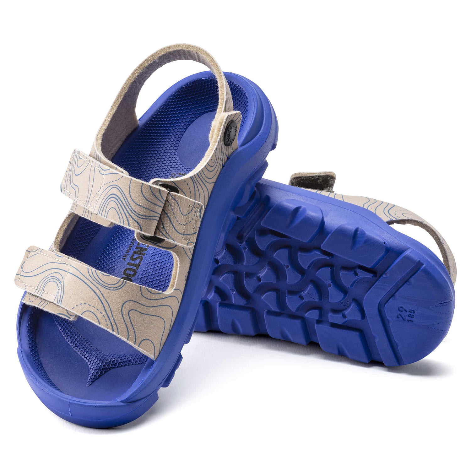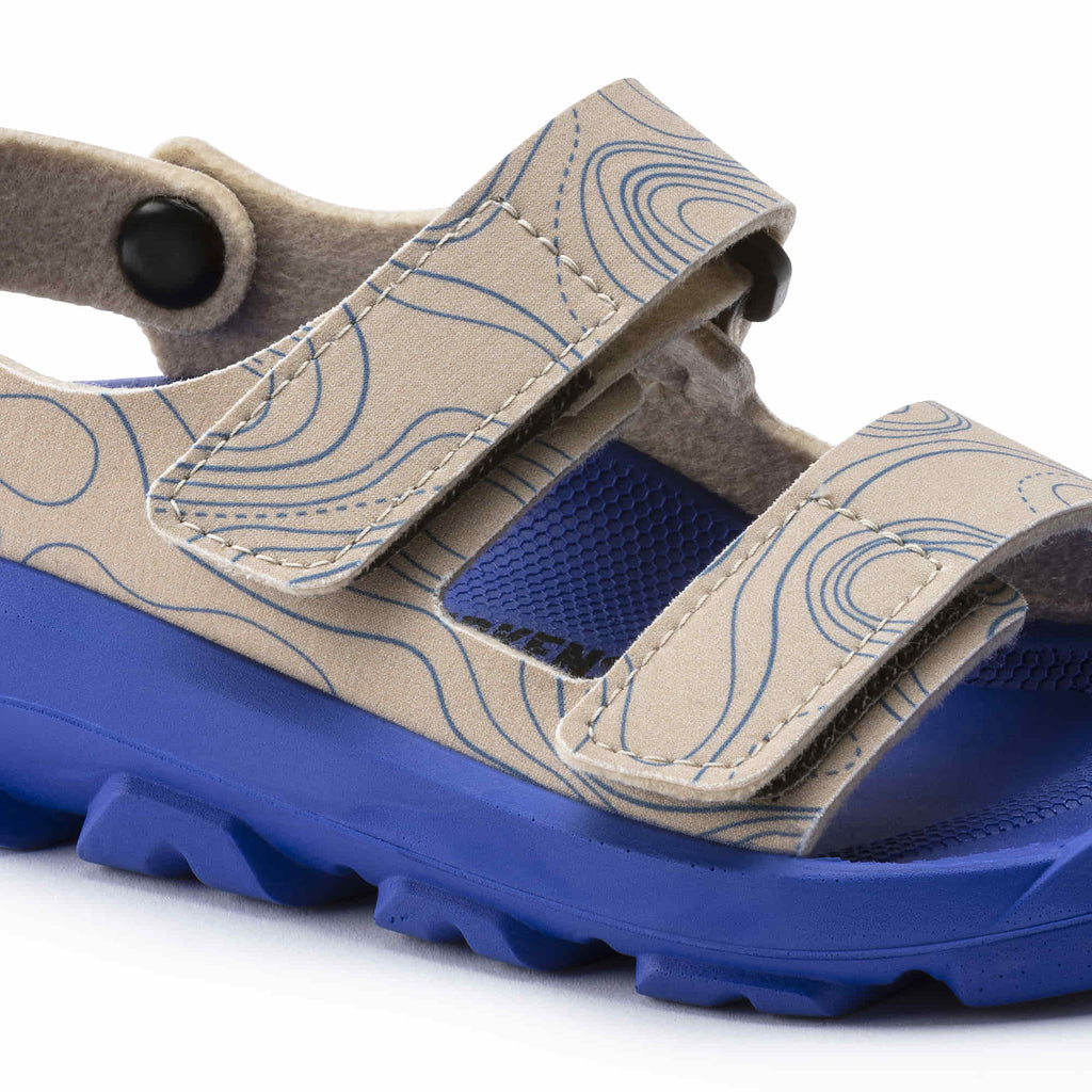 The perfect sandal for the playground, exploring forests, running across meadows and jumping into puddles! With the BIRKENSTOCK Mogami, kids are more than ready for small and big adventures thanks to its waterproof footbed and the highly functional sole. The hook-and-loop fasteners also make family excursions less stressful with their easy handling. They also ensure that the sandals remain on the feet'also during boisterous play! This version features a print inspired by cartography. The upper is made of a skin-friendly synthetic material comprising hard-wearing elastane lined with felt. It absorbs hardly any moisture and dries quickly.