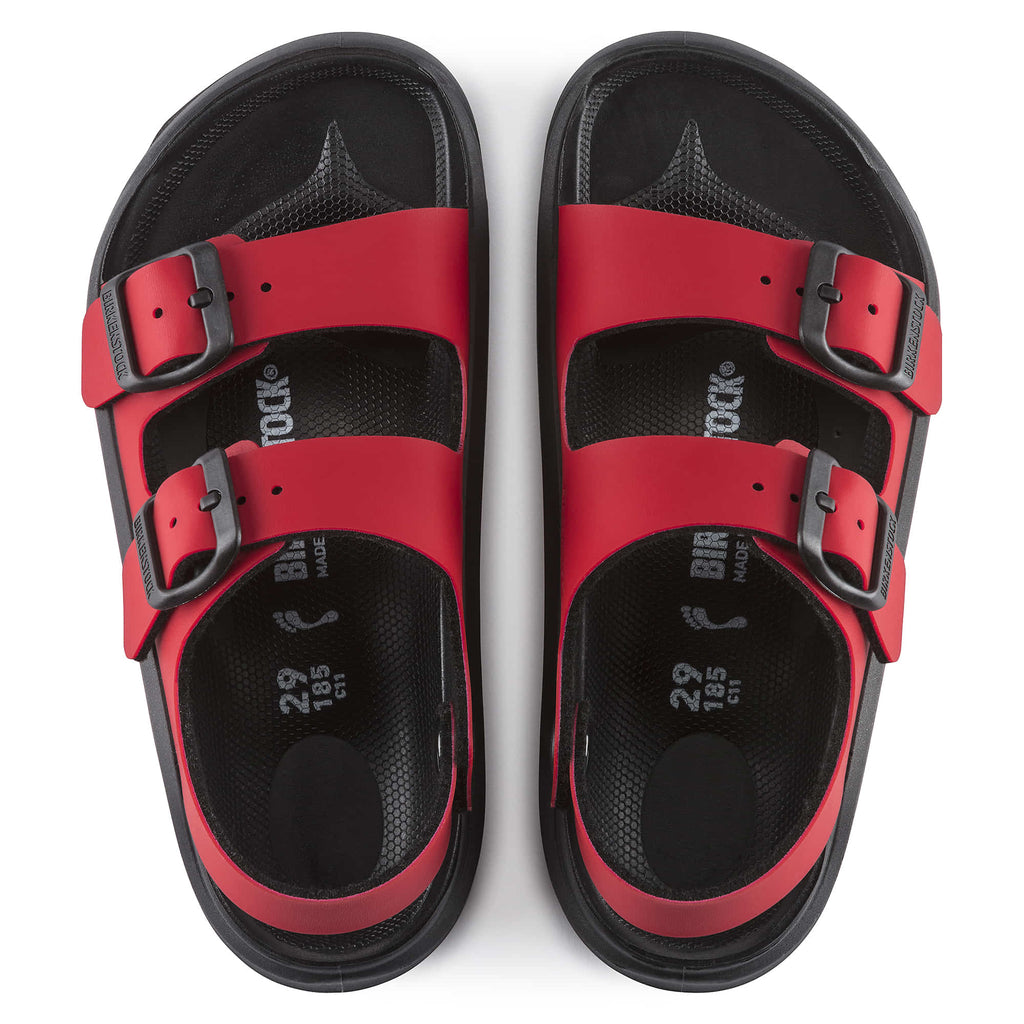 The perfect sandal for the playground, exploring forests, running across meadows and jumping into puddles! The BIRKENSTOCK Mogami is the perfect match for adventures of any kind thanks to the waterproof footbed with toe protection and the highly functional sole which is injected to the footbed and upper in two layers. This makes the sandal extremely flexible, non-slip and durable in any terrain. This version boasts vibrant colors. The upper is made from the skin-friendly, hard-wearing synthetic material Birko-Flor®.