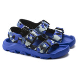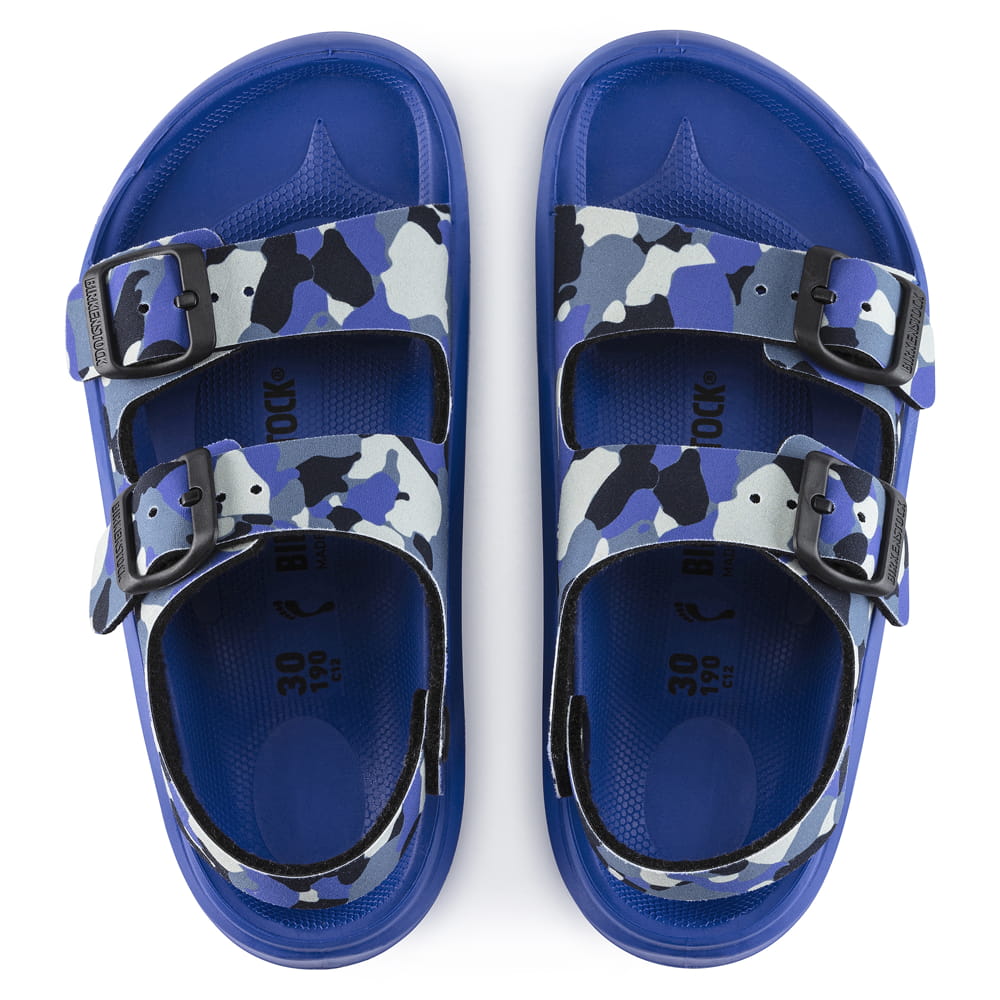The perfect sandal for the playground, exploring forests, running across meadows and jumping into puddles! The BIRKENSTOCK Mogami is the perfect match for adventures of any kind thanks to the waterproof footbed with toe protection and the highly functional sole which is injected to the footbed and upper in two layers. This makes the sandal extremely flexible and durable in any terrain. This version boasts a reinterpreted camouflage look and bright colors. The upper is made from the skin-friendly, hard-wearing synthetic material Birko-Flor® with a polyurethane (PU) coating. The PU coating makes the material more hard-wearing and thus particularly durable.