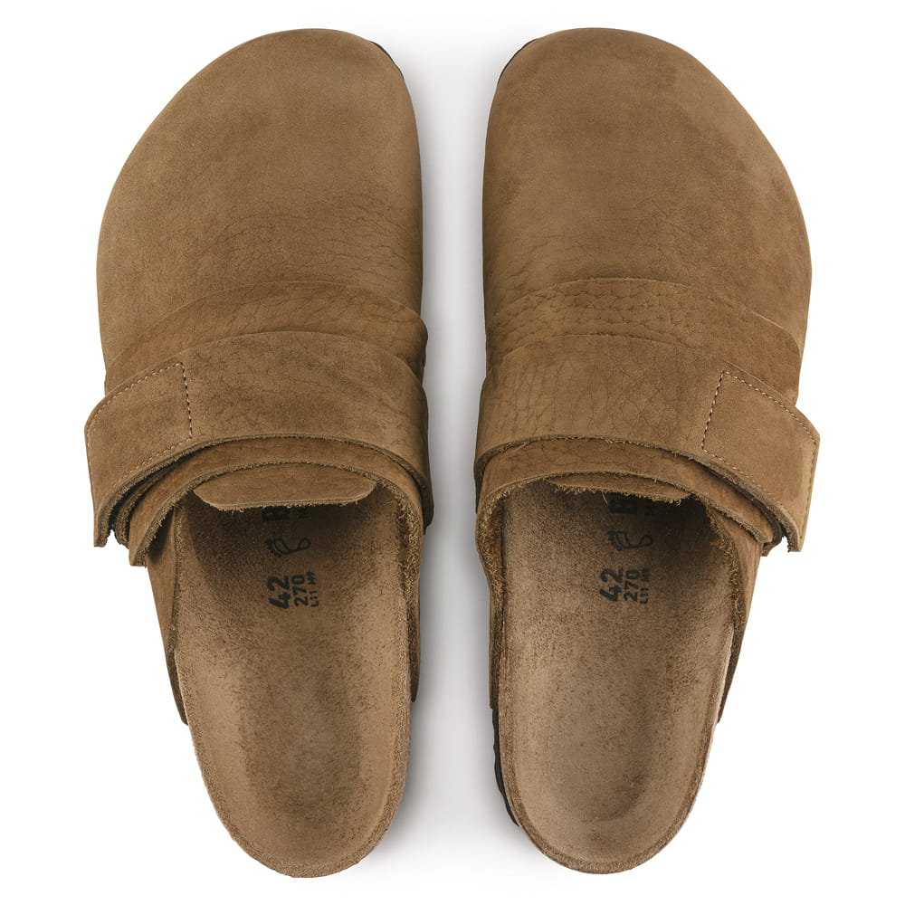 The BIRKENSTOCK Nagoya takes its inspiration from the classic Boston model and stands out with its compact design and individually adjustable buckle. This offers optimum grip and is complemented by two decorative rivets. This version with its grained upper boasts a striking yet natural design. The upper is made from high-quality, soft nubuck leather that boasts a rustic appearance.
