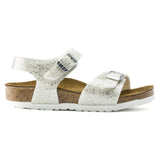 The BIRKENSTOCK Rio is a sporty, elegant sandal with a heel strap that offers reliable and comfortable grip even during boisterous activities. The Cosmic Sparkle version features a striking glitter effect and a shiny coating, making the sandal sparkle and setting girls'­ hearts racing. The color-coordinated outsole rounds off the shoe'­s look of sophistication. The upper is made from the skin-friendly, hard-wearing synthetic material Birko-Flor®.