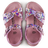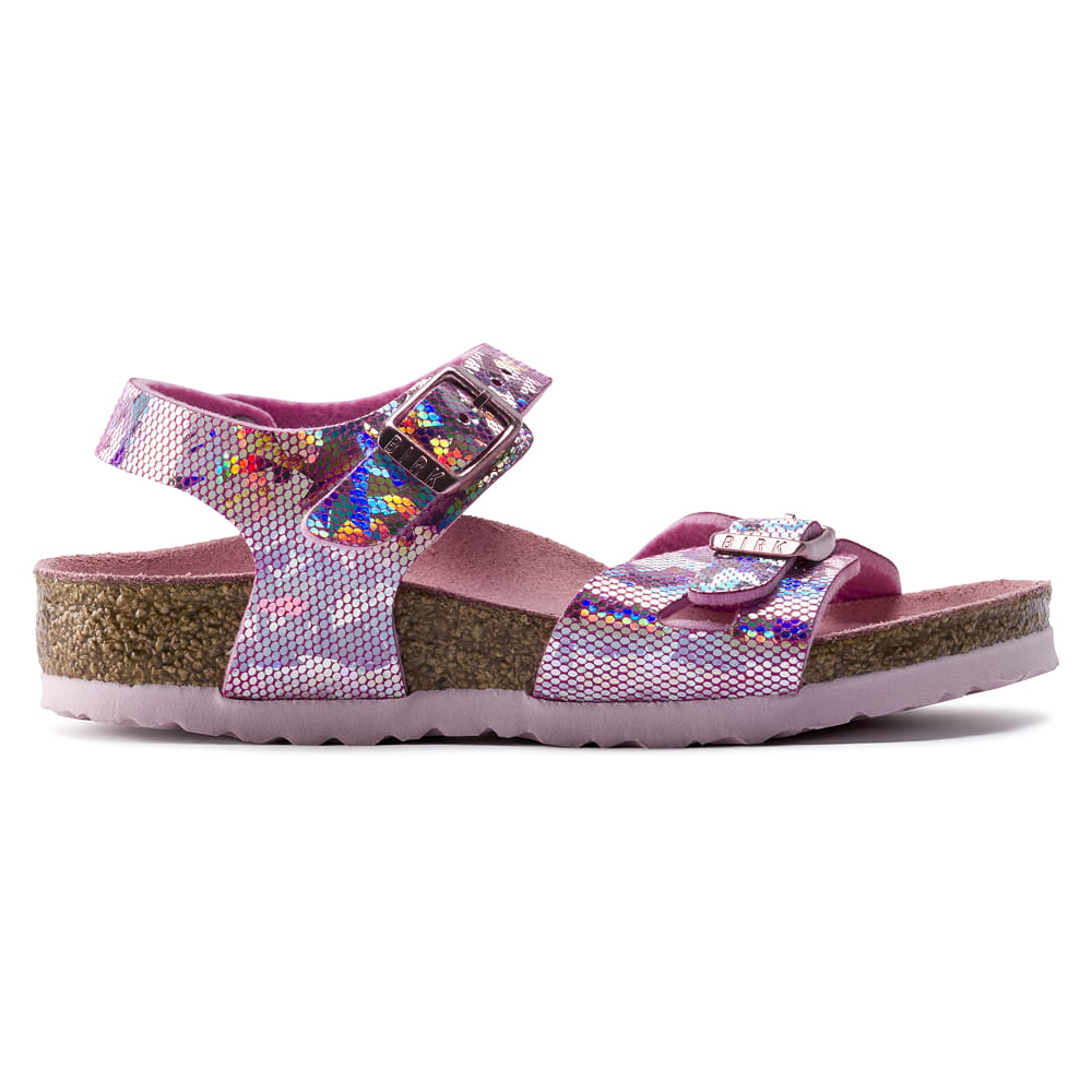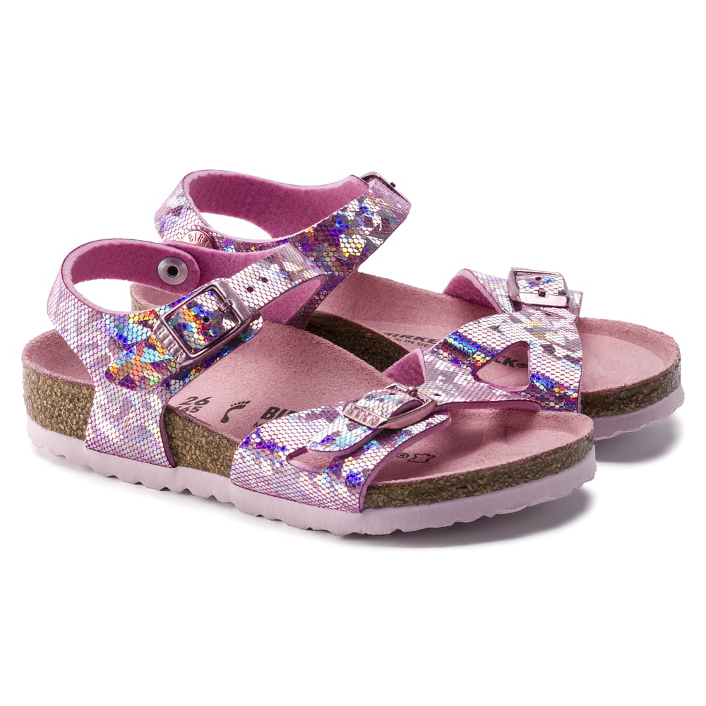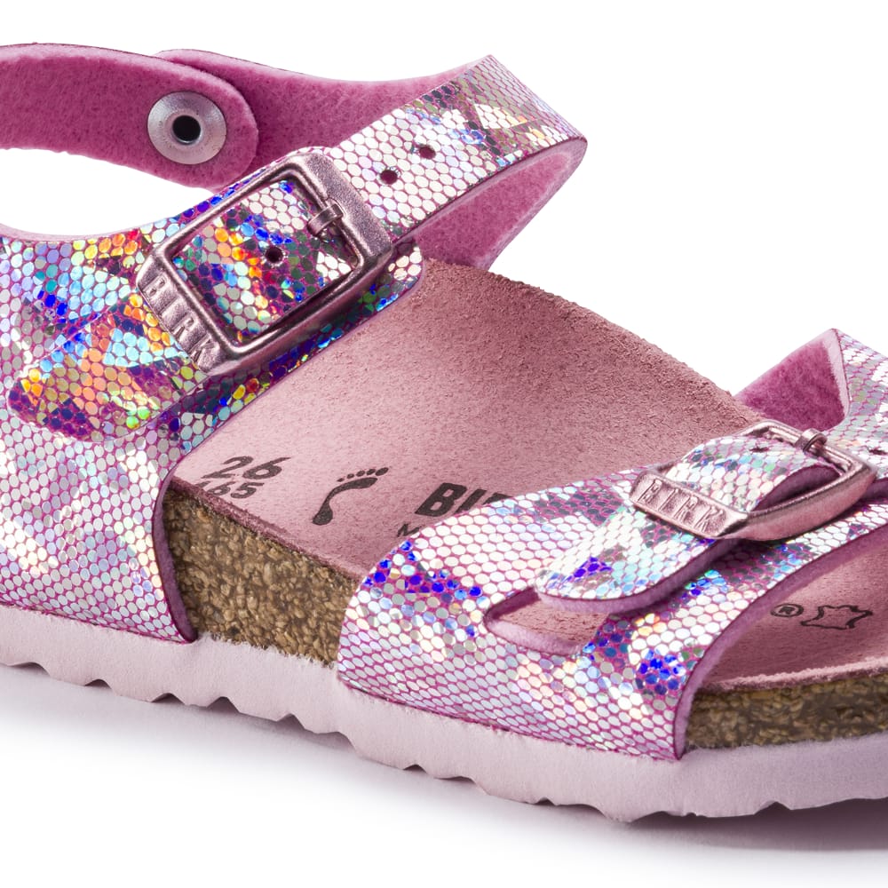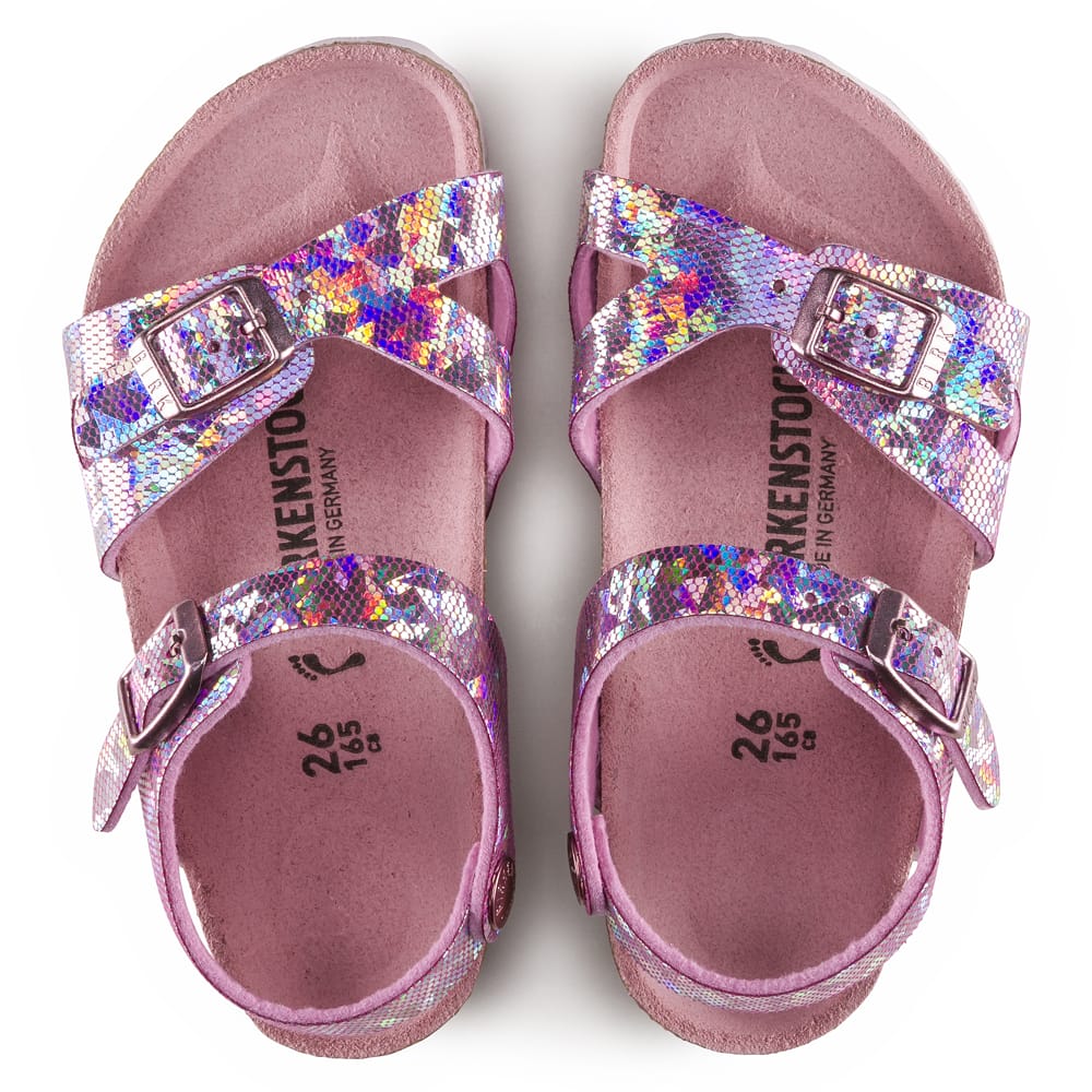 The BIRKENSTOCK Rio is a sporty, elegant sandal with ankle straps. It provides secure and comfortable support “ even during rough-and-tumble play. This model has a striking hologram film that reflects 3D prisms and a silver aesthetic, depending on how the light hits it. Girls' hearts will beat that little bit faster. The elegant style of this shoe is complemented by the colour-coordinated outsole, the footbed and the buckles. The upper is made of skin-friendly and durable synthetic material.