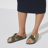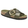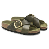 The BIRKENSTOCK Siena boasts a refined appearance. Crossed straps give the sandal its unique and special look. The Big Buckle version features a large, elegant pin buckle a fantastic, striking eye-catcher on this otherwise understated sandal. The lining of the semi-exquisite footbed is covered with soft smooth leather and matches the shoe in color. The upper is made from extra thick, oiled nubuck leather with an open-selvage finish.