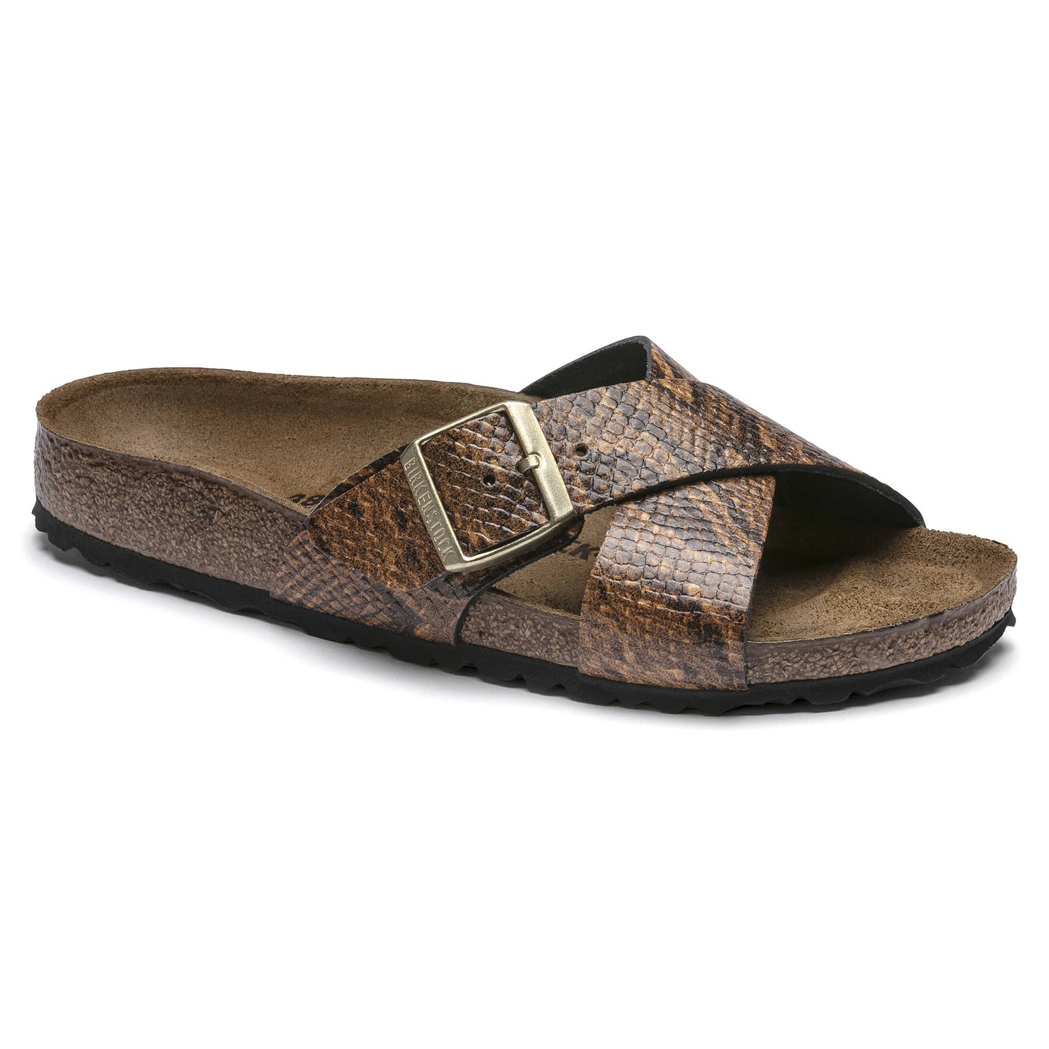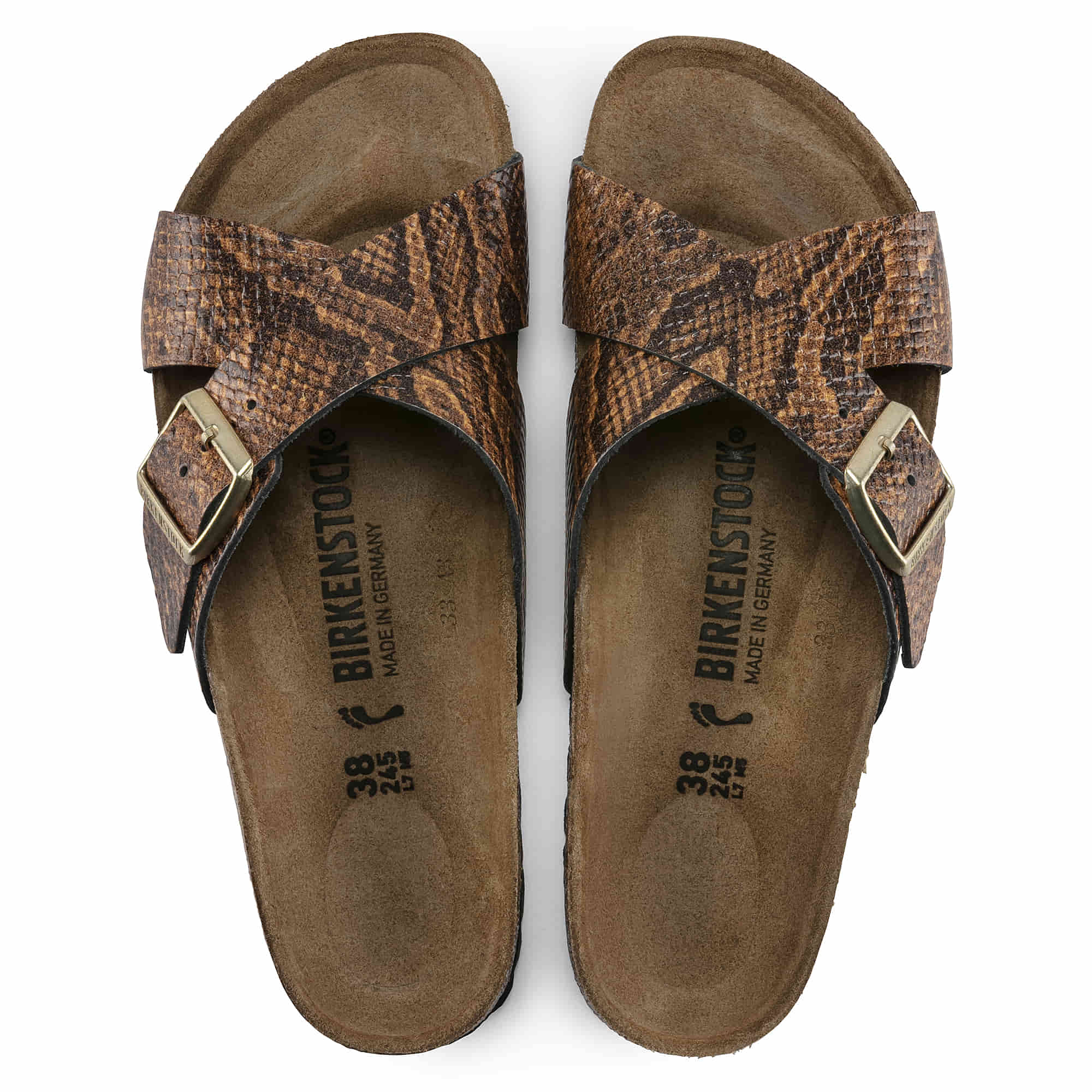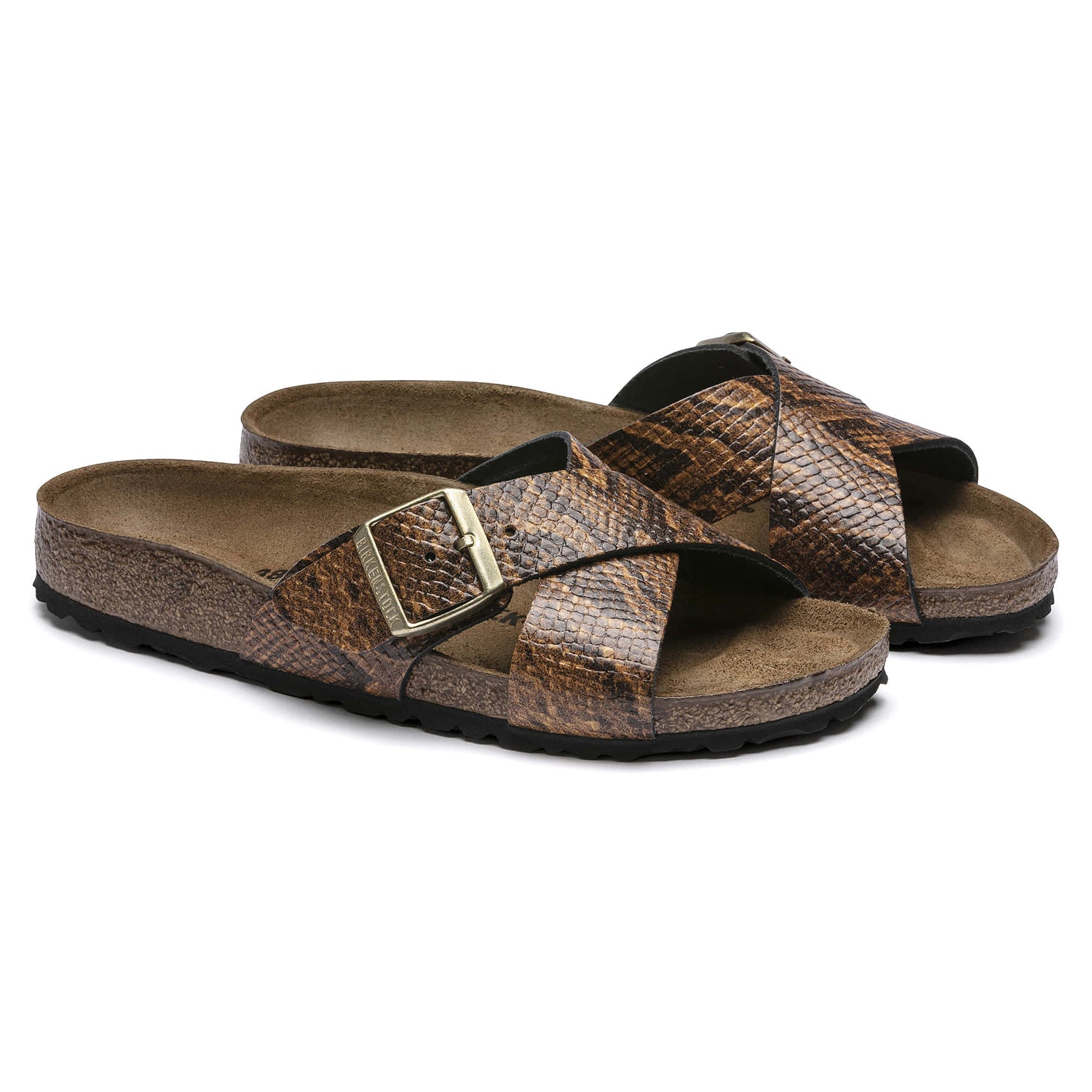 The BIRKENSTOCK Siena boasts a refined appearance. Crossed straps give the sandal its unique and special look. This version stands out thanks to its extravagant snakeskin pattern with a shiny surface. Inspired by nature, no two shoes have the same look and feel. The upper is embossed natural leather.