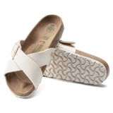 The BIRKENSTOCK Siena boasts a refined appearance. Crossed straps give the sandal its unique and special look. This popular sandal has been given an update in a new material, with a vegan version now available. It is entirely free of animal products, as verified by independent testing laboratories. The color-coordinated buckles with a textile feel and a matte design as well as the color-coordinated outsole are additional eye-catchers. The upper is made from a soft fabric.