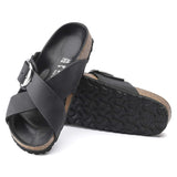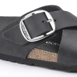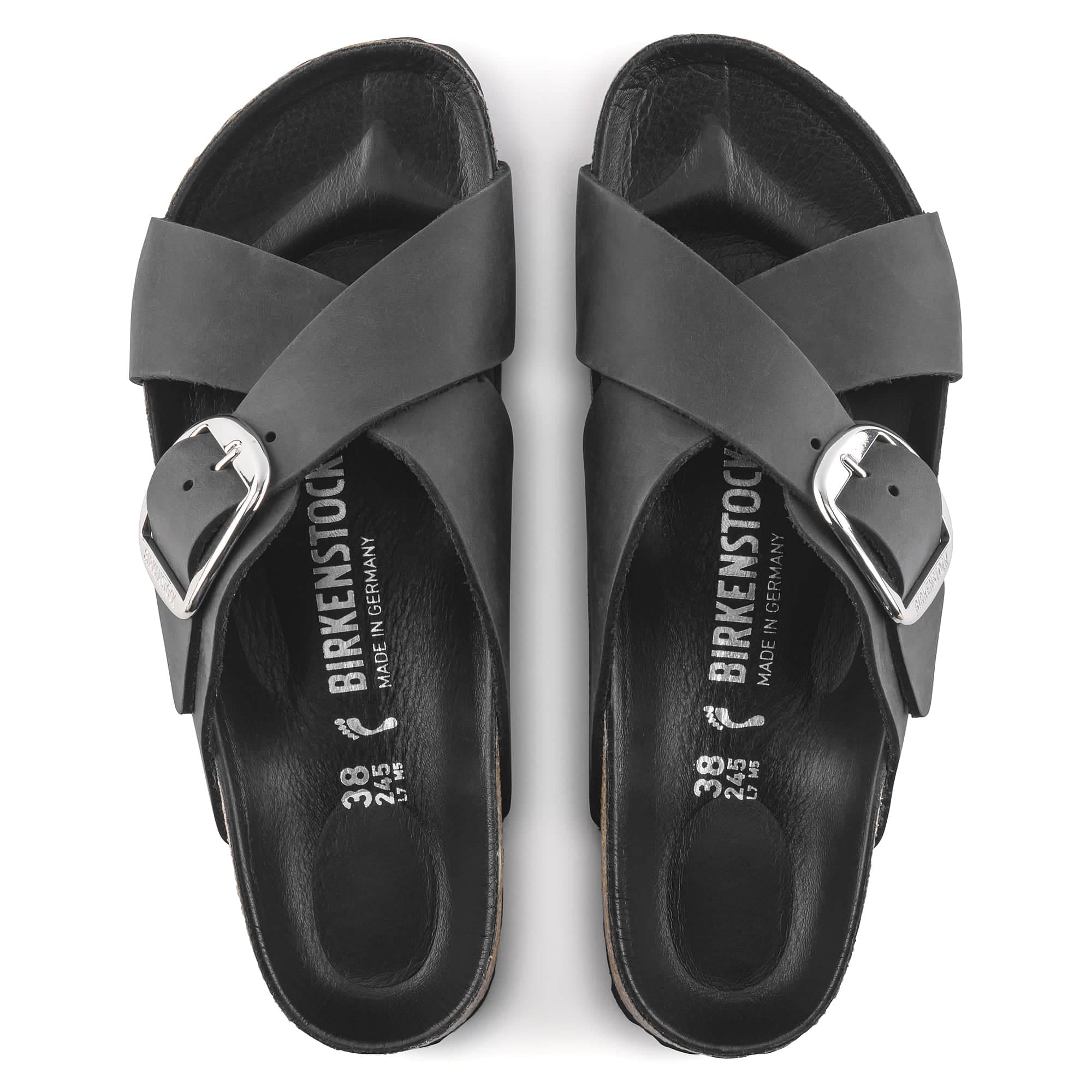 The BIRKENSTOCK Siena boasts a refined appearance. Crossed straps give the sandal its unique and special look. The Big Buckle version features a large, elegant pin buckle a fantastic, striking eye-catcher on this otherwise understated sandal. The lining of the semi-exquisite footbed is covered with soft smooth leather and matches the shoe in color. The upper is made from extra thick, oiled nubuck leather with an open-selvage finish.