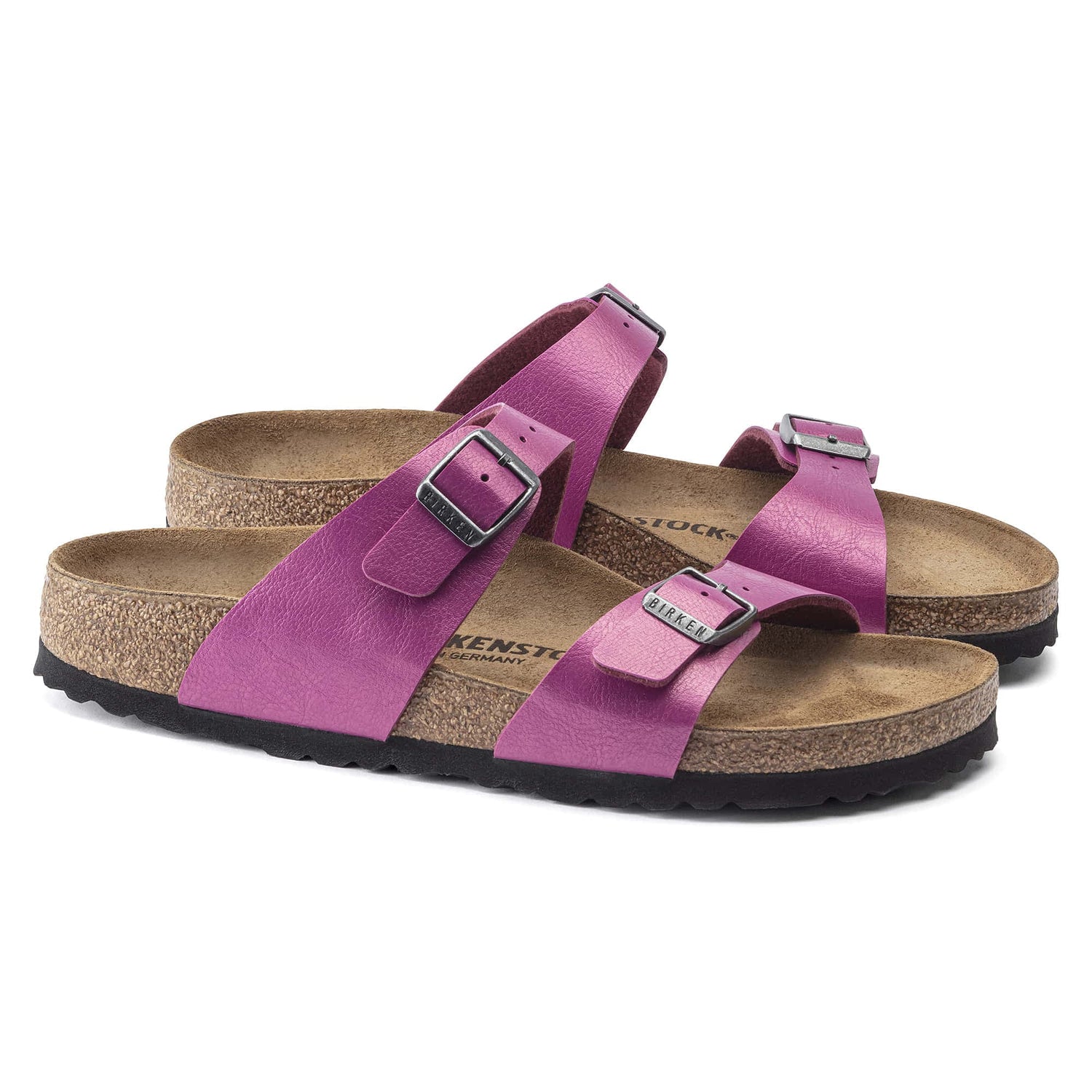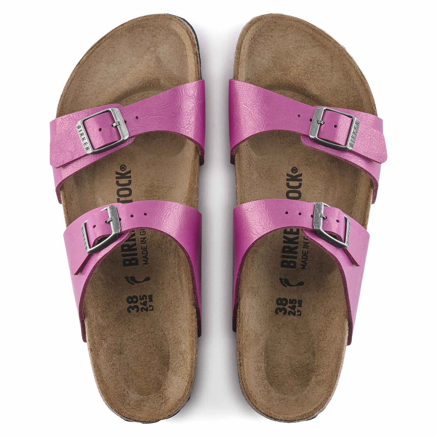 The BIRKENSTOCK Sydney proves that fashion and functionality can go hand in hand. With its two simple straps, its a real hit with women who want both high fashion and comfort. Here, we see the sandal with a silky sheen finish. The color-coordinated outsole and the buckles round off the shoes look of sophistication. The upper is made from the skin-friendly, hard-wearing synthetic material Birko-Flor® with a silky sheen.