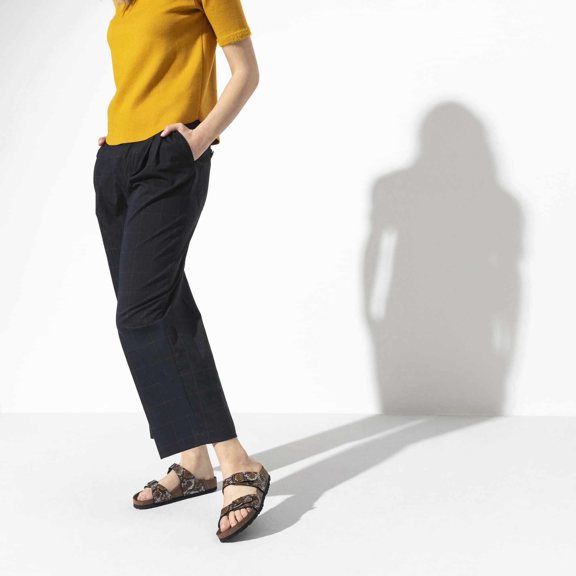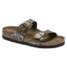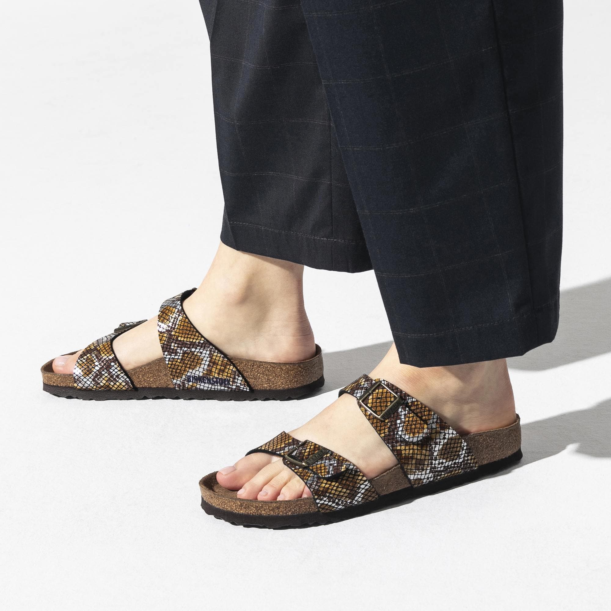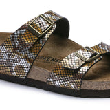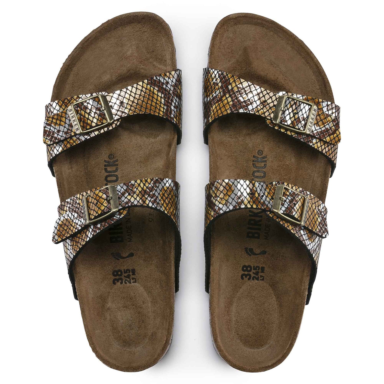 The BIRKENSTOCK Sydney proves that form and function are anything but mutually exclusive. With its two simple straps, it a real hit with women who want both high fashion and comfort. The subtle python embossing lends the sandal its own unique character. Subtle metallic glitter effects accentuate the glamorous look. Inspired by nature, no two shoes have the same look and feel. The upper is made from skin-friendly microfiber.