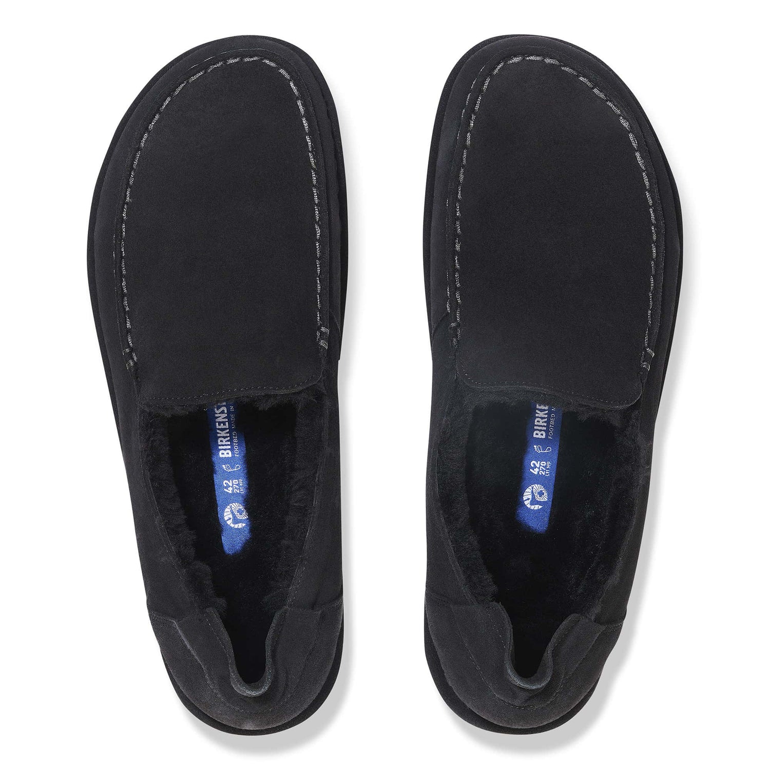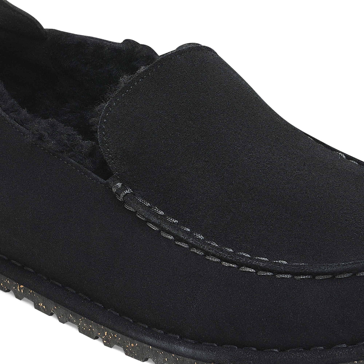 The BIRKENSTOCK Utti is a timeless moccasin-style shoe. The striking stitching catches the eye. The soft heel tab not only guarantees comfort but also ensures that the shoe is easy to put on and take off. The comfortable and light Deep Blue Footbed makes the shoe a perfect 24/7 all-rounder. Here, this classic model comes in an especially cozy version with shearling. Its natural design is down to the upper made from especially soft suede, which hugs the foot like a second skin.