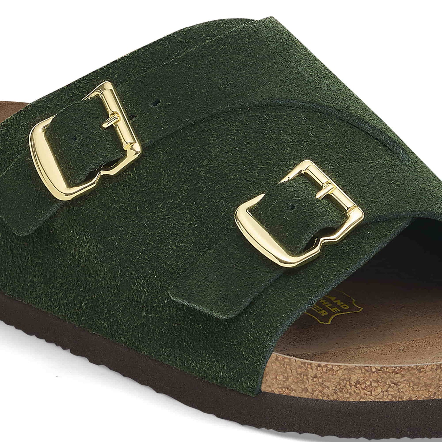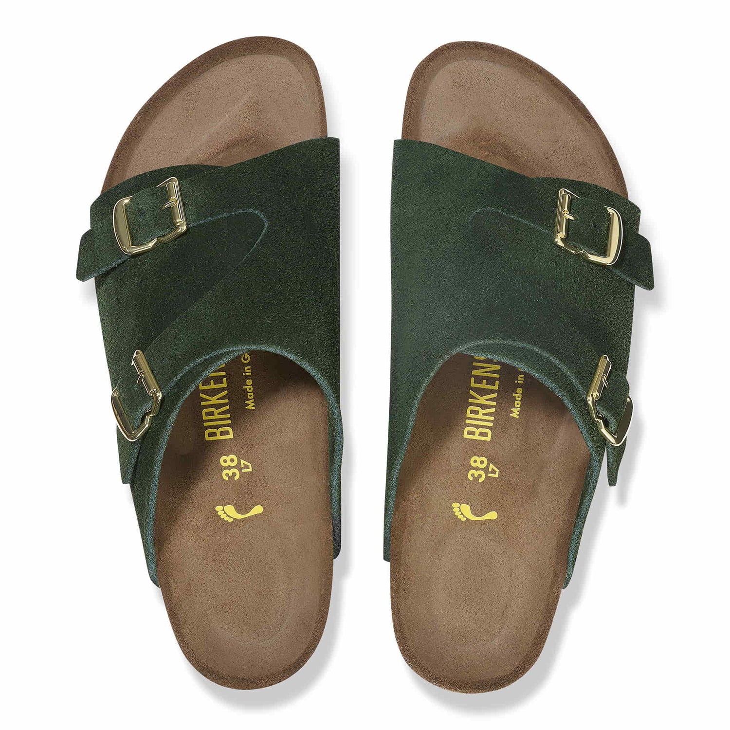 Two in one! The BIRKENSTOCK Zurich combines the stability of an enclosed shoe with the lightness of a sandal. In our Anniversary Collection, we bring back this popular classic in its original design. With its buckles, footbed stamp, outsole and packaging , the sandal looks just like the original from 1964 and exudes real retro flair. The upper is made from especially soft suede which hugs the foot like a second skin.