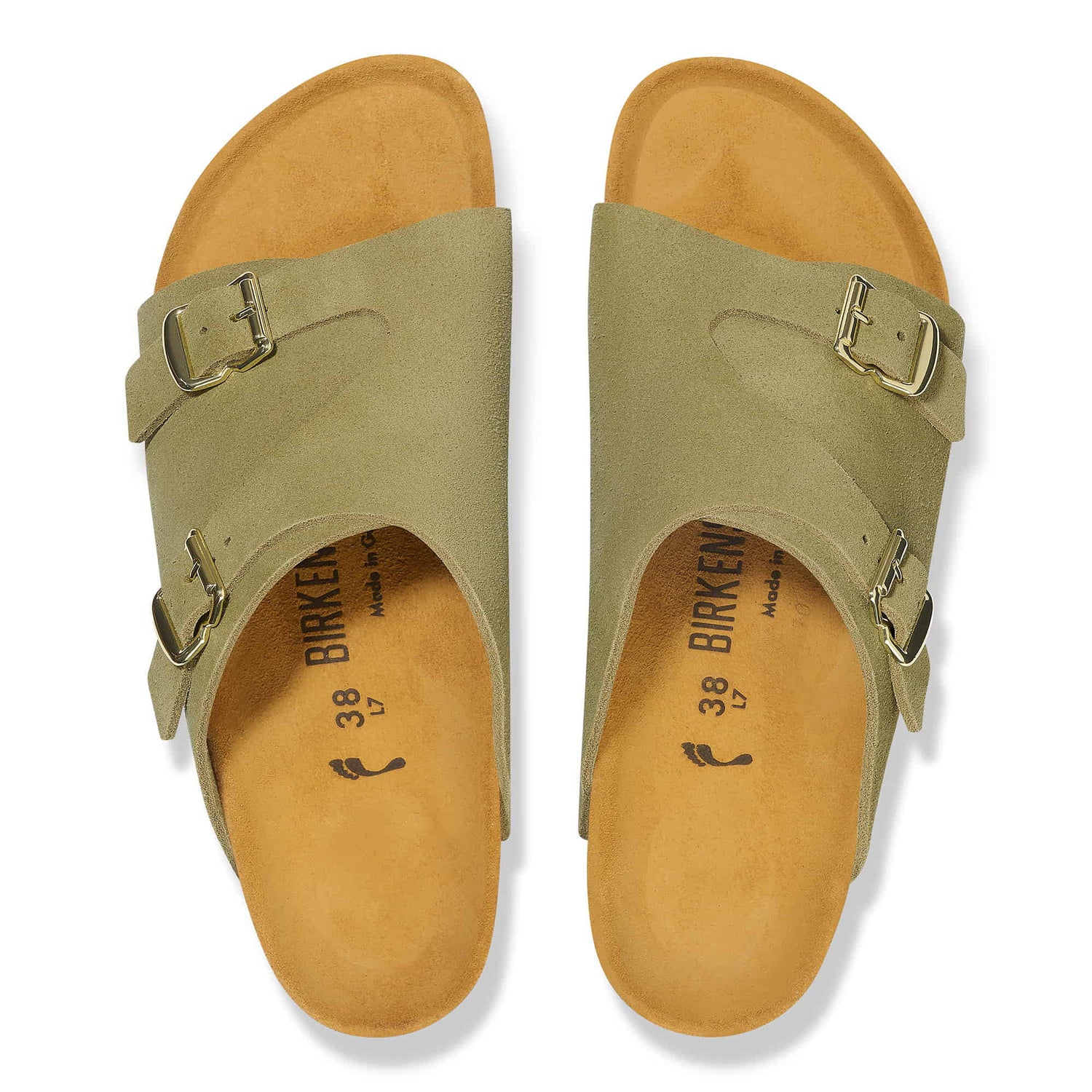 Two in one! The BIRKENSTOCK Zürich combines the stability of an enclosed shoe with the lightness of a sandal. In our Anniversary Collection, we bring back this popular classic in its original design. With its buckles, footbed stamp, outsole and packaging , the sandal looks just like the original from 1964 and exudes real retro flair. The upper is made from especially soft suede which hugs the foot like a second skin.